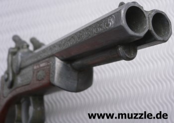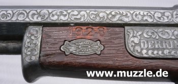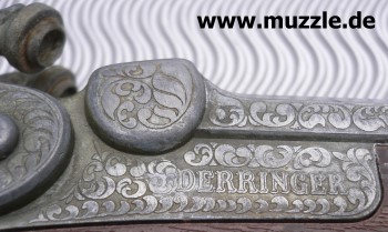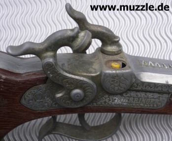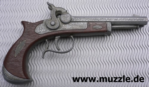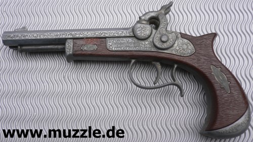 Doppelläufiger Perkussions-Derringer für Knallhütchen. Guss mit Plastikgriffstück in Holzoptik. Hähne können einzeln gespannt werden und lösen einzeln nacheinander aus. Single Action only. Länge 220 mm.