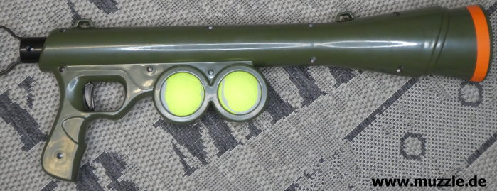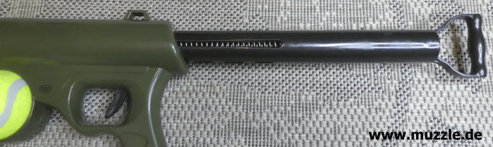 Züngels gibt die innere Mechanik die Halteklinke des Bolzens frei und der Stößel schnellt federgetrieben ruckartig nach vorne. Dadurch wird der Tennisball aus der Mündung befördert und fliegt einige Meter weit