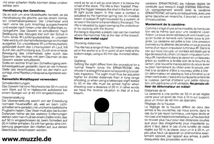 ERMA EG 80 ERMATRONIC Infrarot-Gewehr auf Basis des Unterhebelrepetierers ERMA ELG 10 Federdruck-Luftgewehr weitere ERMATRONIC-Modelle: EG 81 / 811 auf Basis des “ERMA EM 1” (Carbine .30 M1) EG 82 auf Basis des “ERMA EGG1” (Karabiner) EG 83 = Revolver