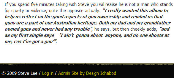 Ein Song geht um die Welt! Zumindest trifft er den Nerv (fast) aller Waffenliebhaber und -sammler und so verbreitet er sich, ausgehend vom Videoportal “YouTube”, u. a. in einschlägigen Internetforen und -websites wie ein Lauffeuer. Der australische Sänger Steve Lee bringt mit seinem wirklich eingängigen “Ohrwurm” (Genre: Alt-Country) seine Botschaft rüber, die praktisch allen legalen Waffenbesitzern aus dem Herzen spricht. Viele bezeichnen das Werk bereits als eine Art Pro-Waffen-Hymne! Und dieser Einschätzung schließe ich mich gerne an. Auf derartiges mussten wir lange warten und um so willkommener ist es jetzt. Jaaa, ...natürlich ist das auch der verwendete Anrufton auf meinem Mobiltelefon. :-) Augenzwinkernd, humorvoll und gewürzt mit einer großen Prise Selbstironie, bringt der sympathische Australier seine Botschaft in einem lebhaften, aktionreichen und sehr sehenswerten Musikvideo an den ge- neigten Konsumenten. Schriftlich äußert er die Intention für dieses Album auf seiner Website folgendermaßen: