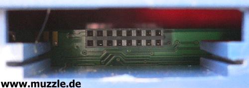 Bild unten links: Blick durch die Trefferscheibe auf die Elektronik des Multifunktionszieles. Hier erkennt man
