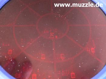 Bilder unten: Blick durch die Trefferscheibe auf das elektronische Innenleben des Grundziels hinter der wech- selbaren Zielscheibe.