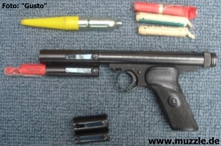 “Druckluft-Waffen”: ”Hülsenpfeilpistole” - Neue Informationen: Wer geglaubt haben mag, zu diesem seltenen Sammlerstück sei bereits alles geschrieben, der sieht sich nun getäuscht! Dank eines engagierten “muzzle.de”-Lesers, wurde nun nicht nur eine handgezeichnete Be- dienungsanleitung dokumentiert, nein, auch eine andere Version der originalen Hülsenpfeile ist nun überliefert.