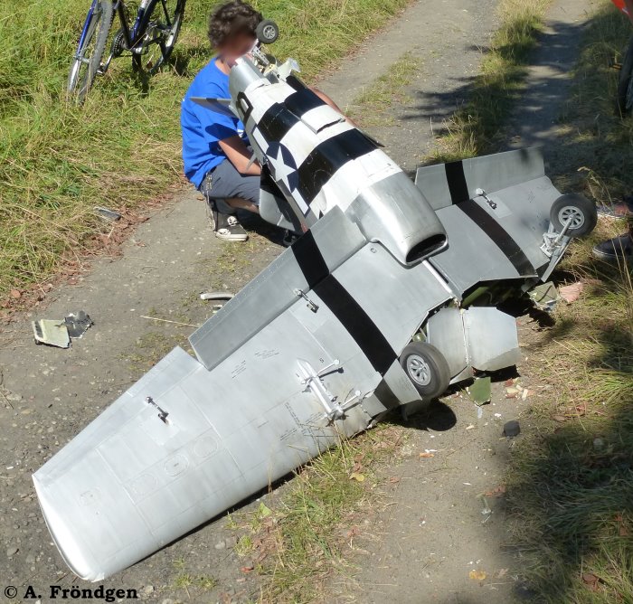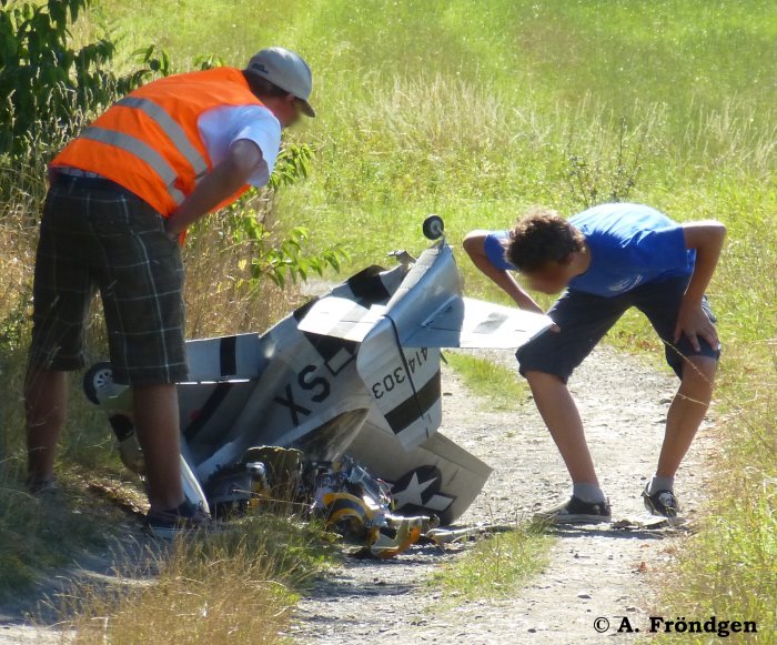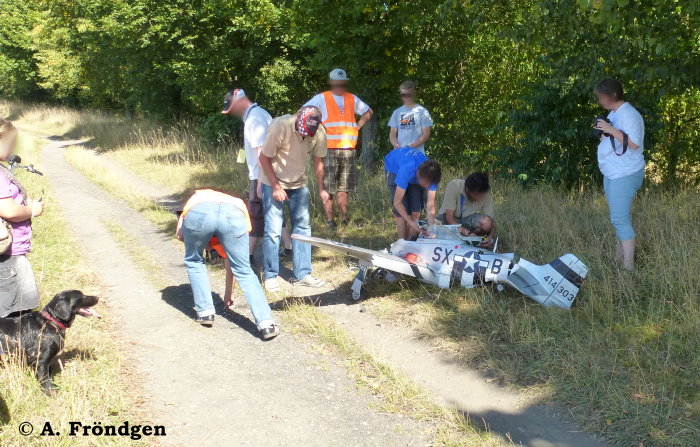 Typ “Mustang” zerschellte auf den Feldweg am Rande des Rollfeldes. Zum Glück wurde niemand verletzt! Der Weg wird von vielen Spaziergängern und Radfahrern genutzt und war aufgrund der Flugschau an diesem Tage besonders stark
