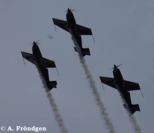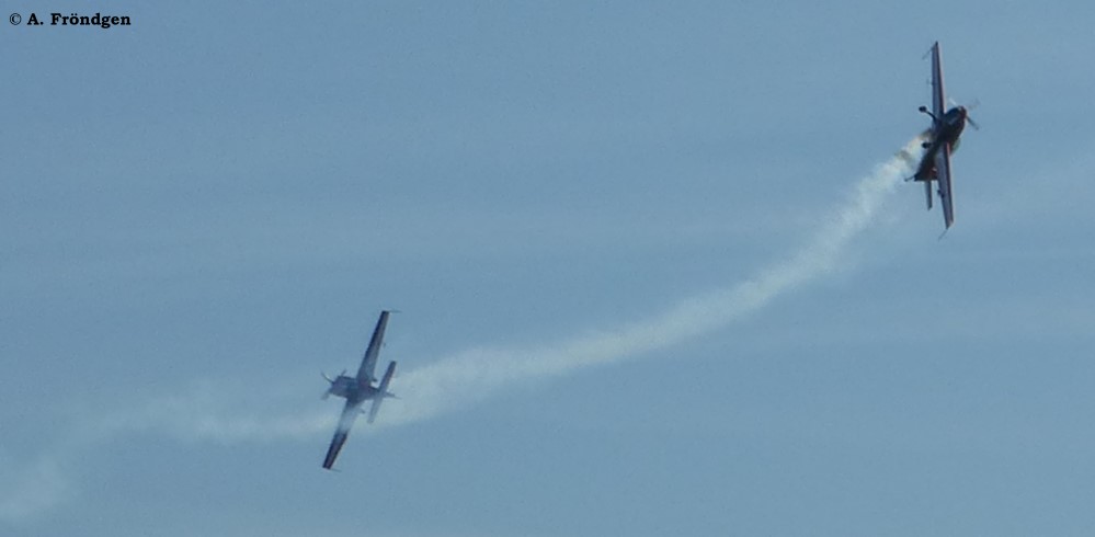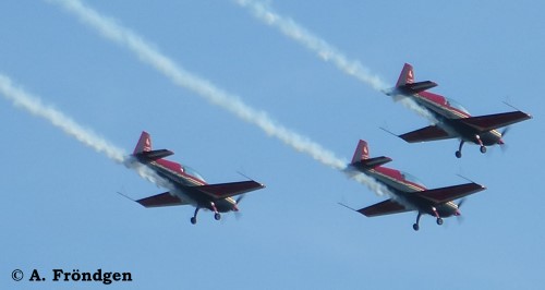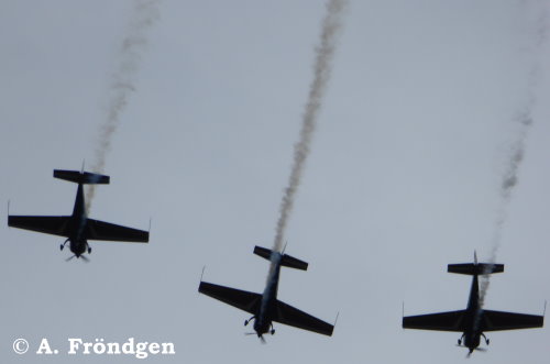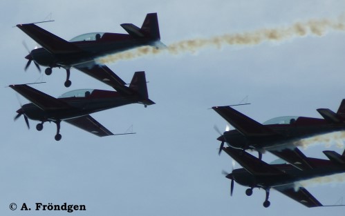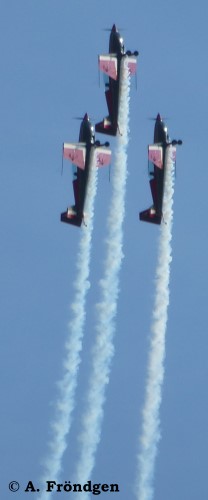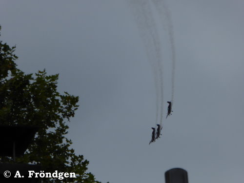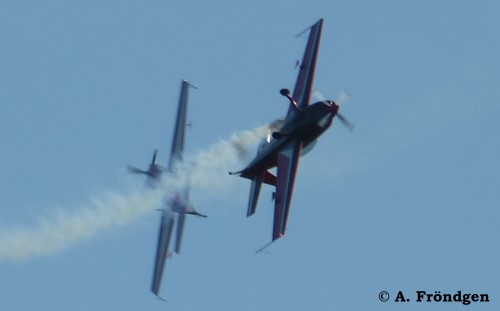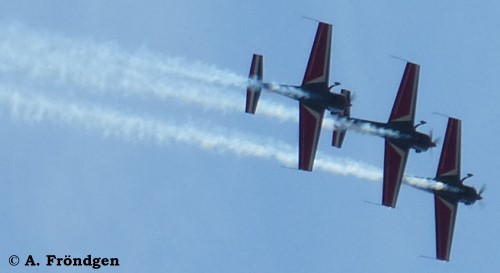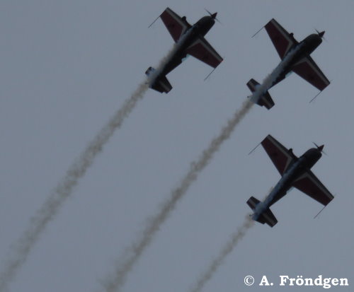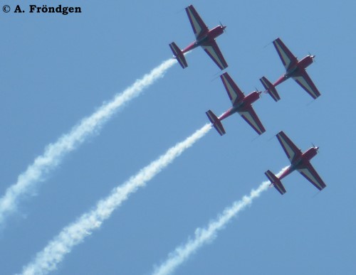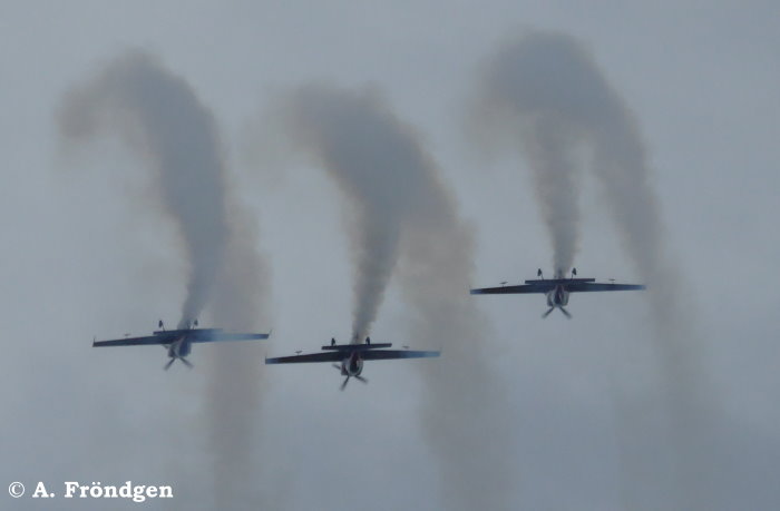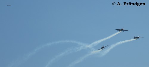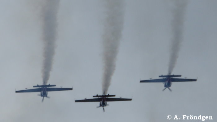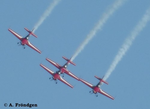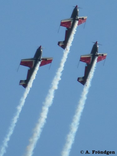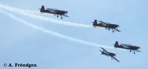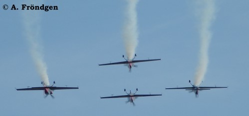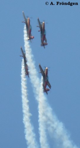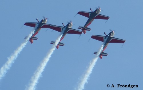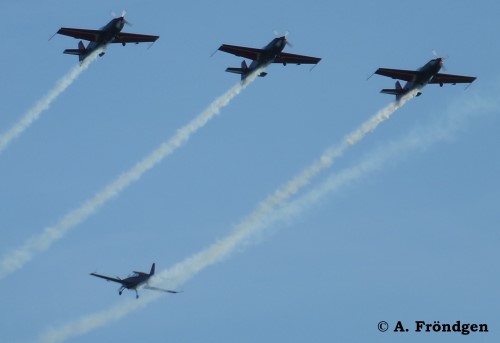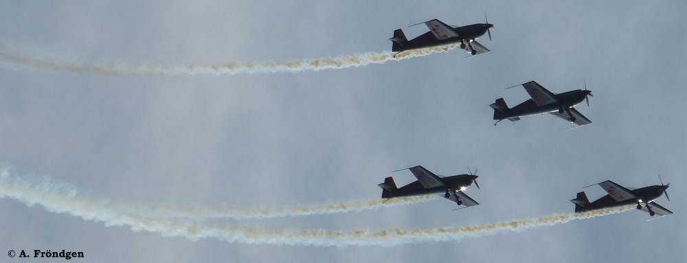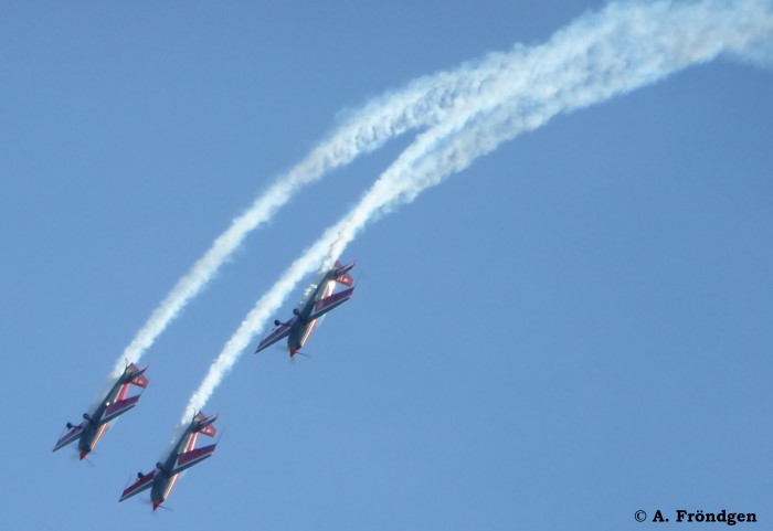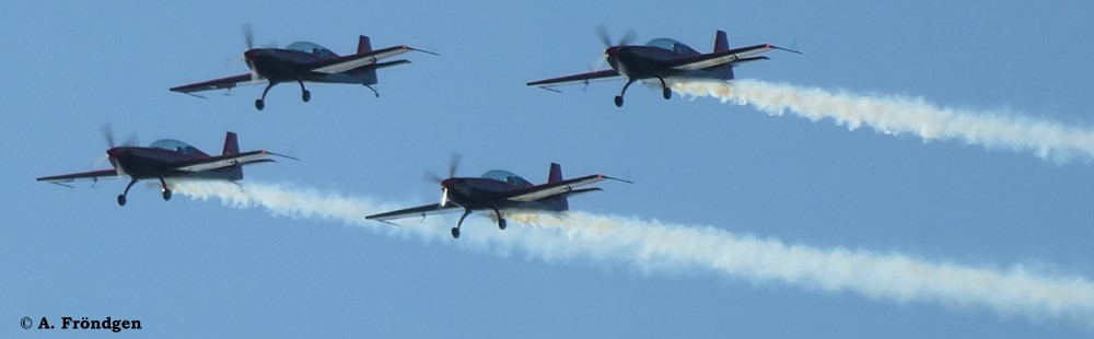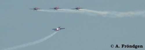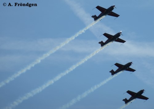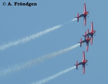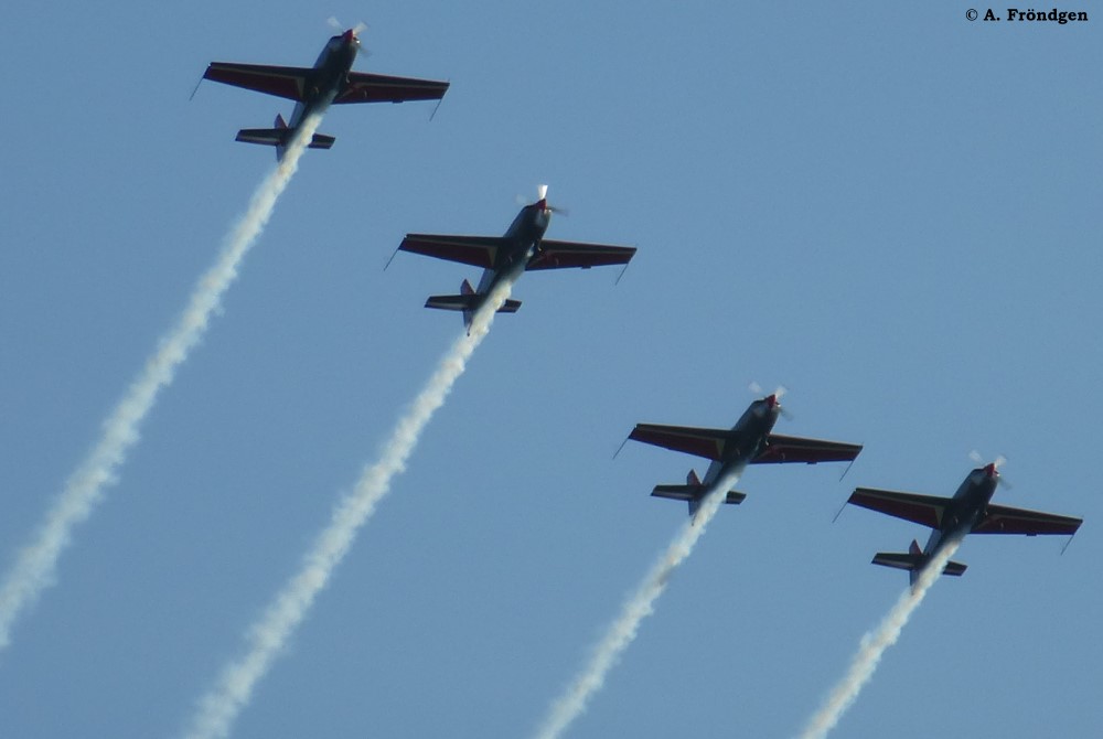 Das Aerobatic-Team zeigt enge Formationsflüge und waghalsige Flugmanöver der absoluten Extraklasse, bei denen sich die Maschinen teilweise auf bis zu 2 Meter annähern. Bei den Vorführungen in Leverkusen lag allerbestes Flugwetter vor: Ein wolkenlos blauer Himmel und hochsommerliche Temperaturen machten den Genuss einer höchst beeindruckenden Flugshow für die Zuschauer perfekt.