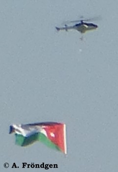 Bevor die ca. 20 minütige Flugshow der “RJF”-Staffel beginnt, präsentiert ein Helikopter die jordanische Staatsflagge: