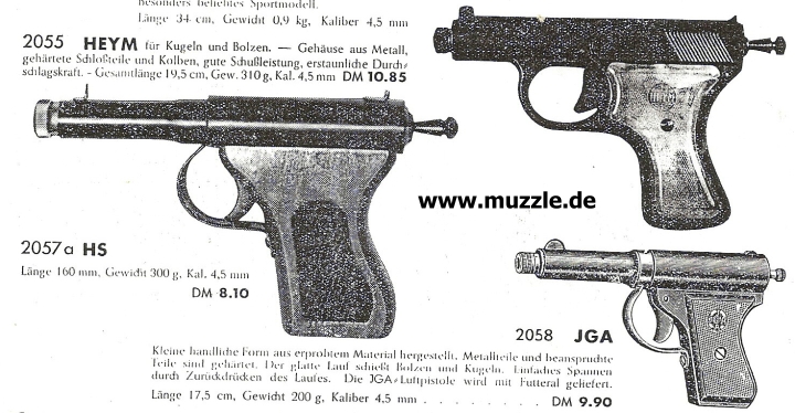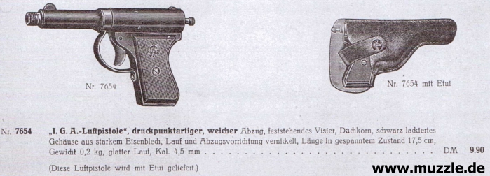 Hersteller: J.G. Anschütz G.m.b.H Jagd- und Sportwaffenfabrik Modell: JGA 100 Serien-Nr.: -keine- Kaliber: 4,5 mm (.177) System: Laufspanner, Federdruck, Einzellader Visierung: Kimme und Korn nicht verstellbar Länge entspannt: 210 mm Länge gespannt: 170 mm Höhe: 96 mm Breite: 25 mm Gewicht: 202 g Ausführung: Systemgehäuse und Griffstück schwarzer Kunststoff, Griffplatten braun beidseitig am Griff die Buchstaben “J.G.A.”, Lauf, Abzug und Abzugsbügel Stahl. Pistole auch mit schwarzen Griffschalen und der Beschriftung “Made in Germany” im Umlauf. Geschichte: Diese “J.G.A.-Luftpistole “Modell 100” wurde von Anfang der 1950er Jahre bis in die frühen 1960er Jahre gebaut und derweil in unterschiedlichen Versionen angeboten. Es begann zunächst mit einer Metallkonstruktion, analog des Vorkriegs-Modell "Dolla". Später erhielt sie einen Kunststoffkorpus. Auch die Griffschalen änderten sich. Soweit mir bekannt wurden zunächst hölzerne, dann mit Umstellung auf das Kunststoffgehäuse schwarze und später braune Griffschalen verbaut. Hinweis: Die Fotos der “Anschütz LP100” mit schwarzen Griffschalen nebst grünem Holster wurden mir von “muzzle.de”-Leser H. Hofmann zugesendet und zur Veröffentlichung freigegeben. Vielen Dank dafür!