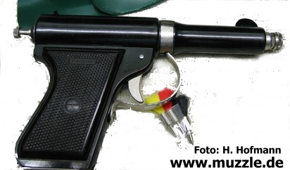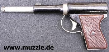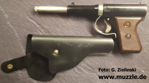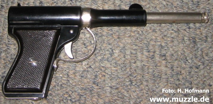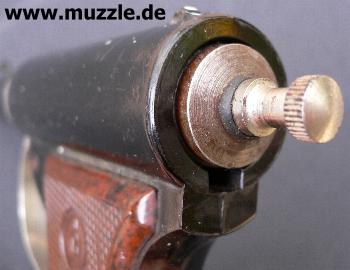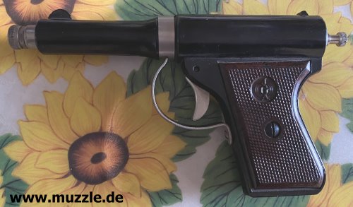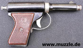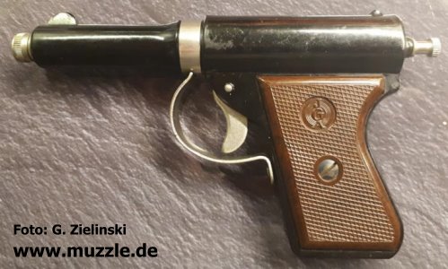 Funktionsweise der Pistole: Der vorne aus dem Laufmantel herausragende Lauf wird gegen die Federspannung in das Gehäuse der Pistole geschoben. In die Endposition gebracht, rastet der Lauf in seiner Arretierung ein. Das hintere Ende des Laufes wird in der Gehäuseöffnung oberhalb des Griffstückes sichtbar, wo nun die von einem Schraubdeckel verschlossene Ladeöffnung erreichbar ist. Nach dem Herausdrehen des Schraubverschlusses, kann das Projektil in den Schacht platziert werden. Anschließend wird der Ladeschacht wieder verschlossen, wobei das Geschoss von einem Stößel am Verschluss weiter in den Lauf geschoben wird. Die Pistole ist nun gespannt und geladen und damit schussbereit. Das Betätigen des Abzuges löst die Arretierung des Laufes, der von der Federkraft getrieben nach vorne schnellt. Dabei wird die Luft in der Druckkammer komprimiert, dringt in die vorgesehenen Öffnungen hinter dem Projektil in den Lauf ein, und presst dieses mit Druck aus dem Lauf heraus. GUNIMO März 2005 / Januar 2012 / Juli 2013 / Februar 2018 / Mai 2022