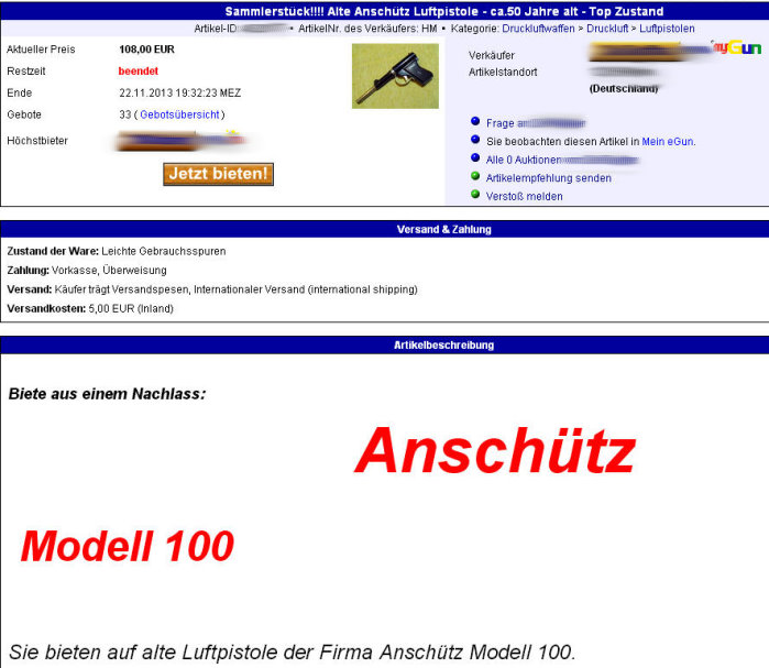 Hinweis: Die Fotos der “Anschütz LP100” mit braunen Griffschalen nebst schwarzem Holster wurden mir von “muzzle.de”-Leser G. Zielinski zugesendet und zur Veröffentlichung freigegeben. Vielen Dank dafür!