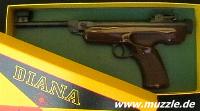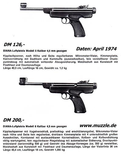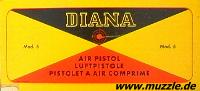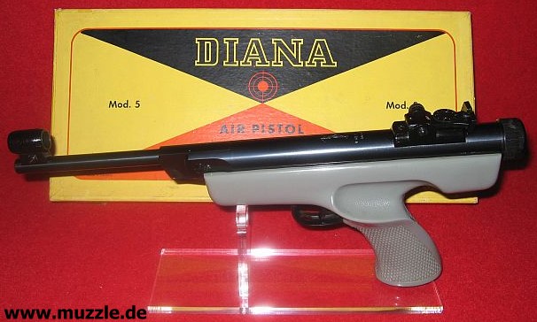 Modell 6 (Bild oben): Fertigungszeitraum 1960 - 1978, erste Pistole mit Massenausgleich auf dem Markt. Bild oben rechts: Diana 5 (vorne) und Modell 6 (hinten) Foto unten: Diana 5 “Arizona”. Spezialanfertigung für die Indoor-Münz-Schießbude mit dem Namen “Arizona”. Die Pistole wird mit der Halterung an der Mündung fixiert und befindet sich dann außerhalb des Schießkastens, die Mündung ragt in diesen hinein. Als Visierung dient ein umgekehrtes Teleskop, welches das Ziel weiter weg vom Schützen erscheinen lässt und so eine größere Schussdistanz vorgaukelt. Es handelt sich also um eine Art “Fernsichtschießstand”.