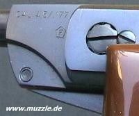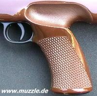 Visierung: Korn statisch, Korntunnel, Kimme horizonal und vertikal justierbar (Rastschrauben), Kimmenblatt austausch- bar Ausführung: System brüniert, braunes Kunststoffgriffstück mit Daumenmulde (Waffe auch mit grauem Griffstück erhält- lich)