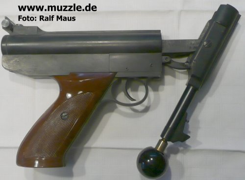 Bei den beiden u. g. Fotos steckt der Spannknopf im Lauf, der bei Bedarf in die Mündung gesteckt wird. Dieser