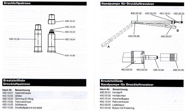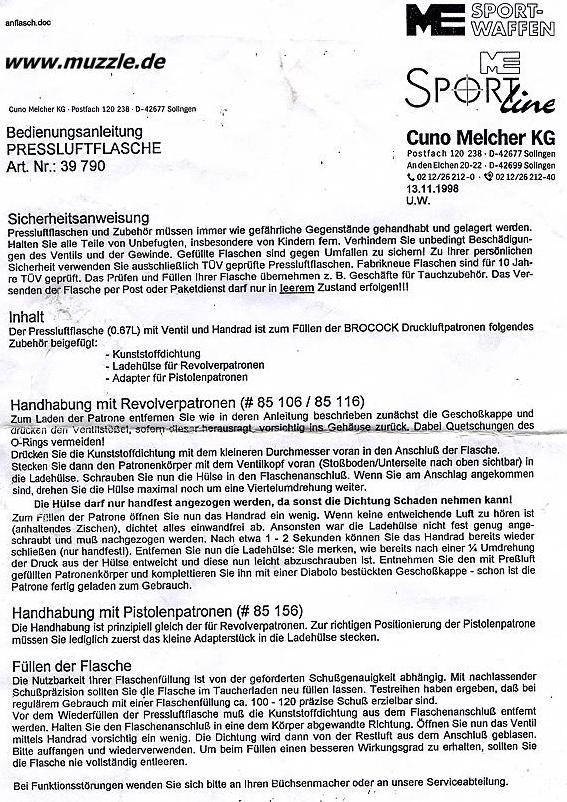 *Handhabung der Handpumpe: - Pumpe durch vollständiges Herausziehen des Handhebels bis zum Anschlag öffnen - Ladekappe aus der Abschlusskappe herausdrehen - Patronenkörper mit der Vorderseite voran in die Ladeklappe stecken - Ladeklappe wieder auf die Abschlusskappe schrauben (!!! Die Ladeklappe niemals zu fest in die Abschluss- kappe schrauben! Diese nach dem spürbaren Anschlag wieder eine halbe Umdrehung zurückdrehen!!!) - Nun mit 6 – 8 Pumpstößen zwischen dem oberen und unteren Anschlag der Pumpe Druck aufbauen. (Der maximale Druck ist nach 8 Pumpvorgängen erreicht. Weiteres Pumpen schadet lediglich den Dichtungen, kostet unnötig Kraft und bringt keine Leistungssteigerung der Patrone.) Es ist unbedingt notwendig, die Pumpe voll- ständig bis zum oberen Anschlag zu öffnen und ca. 2 Sekunden in dieser Position zu halten, damit Luft in den Zylinder einströmen kann. (Wird durch vernehmbares Zischen angezeigt.) - Nach dem letzten Pumpstoß die Pumpe wieder vollständig öffnen, damit kein Restdruck den Dichtring aus der Abschlusskappe herausdrückt. - Ladekappe herausdrehen und Patronenkörper entnehmen. Die fertig bestückten LEPs können nun in eine geeignete Waffe geladen und verwendet werden. Dazu bitte unbedingt die Herstellerhinweise zum Umgang mit diesen Waffen beachten. LEP-Waffen sind oftmals ehemalige „scharfe“ Revolver, Pistolen oder Gewehre, die durch entsprechenden Umbau zu LEP-fähigen Waffen umfunktioniert wurden, und in Deutschland dann mit einem „F“ im Pentagon versehen werden müssen. Anbieter der Umbautechnik sind „LEP-AREON“ und „Reducta“. Etliche Modelle der Firma „ME“ (Kuno Melcher), sind hingegen Exemplare, die von Anfang an für die Verwendung von LE-Patronen konzipiert wurden. Wichtiger Hinweis: Seit dem 1.4.2008 sind vormals scharfe Waffen, welche später auf die LEP-Technik umgebaut wurden, in Deutschland nicht mehr frei ab 18 Jahren! Der Altbesitz musste bis zum 1.10.2008 behördlich angemeldet werden und ist seither an erhebliche Auflagen gekoppelt. Wer diesen Meldetermin ver- säumt hat, besitzt nun de facto eine illegale Schusswaffe. LEP-Waffen, die von Anfang an für diese Druckluft- Technik konzipiert wurden, sind aber nach wie vor ab dem 18. Lebensjahr zu besitzen, vorausgesetzt sie haben eine “F”-Kennzeichnung. Der Vorteil dieser Waffenart ist sicherlich, dass sich jeder geneigte Interessent ab dem vollendeten 18. Lebensjahr eine konvertierte Originalwaffe ohne den sonst üblichen Behördenaufwand zulegen kann. Das Händling entspricht weitestgehend dem einer „scharfen“ Waffe. Allerdings reicht die Energie einer LE-Patrone nicht dazu aus, den Schlitten einer ehemals halbautomatischen Pistole zu repetieren. Dieser Vorgang muss einzeln von Hand durchgeführt werden. Ein klarer Pluspunkt für einen Revolver, ebenso wie die Tatsache, dass die Patronen bei einem Revolver im Trommellager verbleiben, während sie beim Handrepetieren einer Pistole ausgeworfen werden. Dabei landen sie der Schwerkraft folgend irgendwo am Erdboden, was den recht empfindlichen Messingpatronen nicht sonderlich zuträglich ist! Insgesamt ist das Vorladen der Patronen eine immens aufwändige Tätigkeit. Bei einem 6-schüssigen Revolver mit einer kompletten Trommelfüllung, sowie maximal aufgepumpten Patronen, ergeben sich schon mal 48 Pumpstöße mit der Handpumpe. Rechnen wir weiter, dann hat man nach drei Schießdurchgängen (18 Schuss) bereits 144 mal gepumpt. Der Krafteinsatz, besonders bei den letzten Pumpstößen je Patrone ist nicht gering. Alles in allem erspart einem das den Gang ins Fitness-Studio. Allerdings kann man die Waffe kaum noch ruhig im Ziel halten, da die Arme durch das muntere Pumpen doch recht zittrig geworden sind.