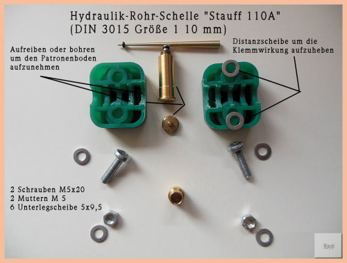 Kolbenstange besser wechseln zu können. Ausgangsmaterial ist eine handelsübliche Rohrschelle: “Stauff”-Rohrschelle 110A (DIN 3015). “Stauff” ist der Hersteller der die Schelle entwickelt hat. Die gibt es