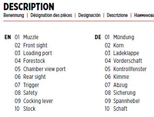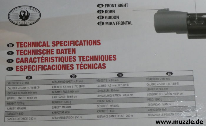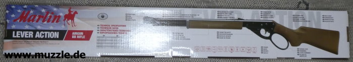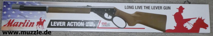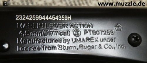 Hersteller: UMAREX Deutschland GmbH & Co. KG Lizenz: offiziell lizenziertes Produkt durch “Sturm, Ruger & Co. Inc.” (USA) Historie: “Marlin Firearms”, gegründet 1870 - Das Unternehmen wurde 2007 eine Tochtergesellschaft von “Remington Arms” und 2020 von “Sturm, Ruger & Co. Inc.” übernommen. Serien-Nr.: 2324259944454359H Baujahr: 2024 Kaliber: 4,5 mm BB (.177) Magazinkapazität: 650 Kugeln Geschossgeschwindigkeit (V0): ca. 91 m/s (Herstellerangabe) System: Federdruck (Kolbenfeder), Unterhebelrepetierer (Lever Action) Abzug: Single Action