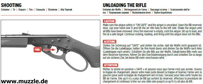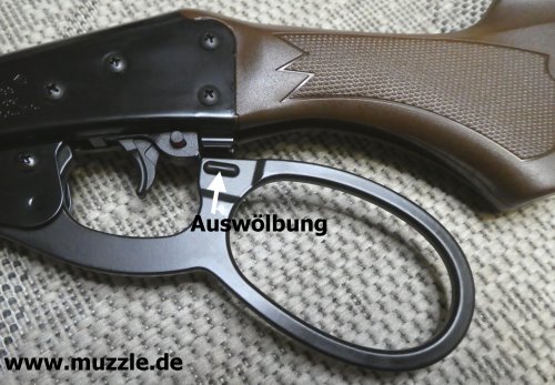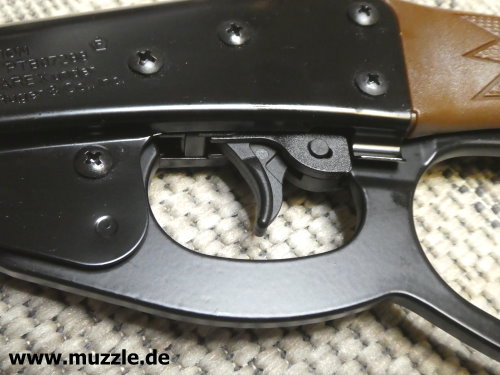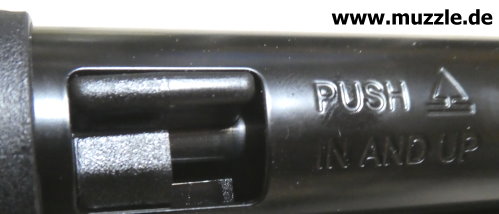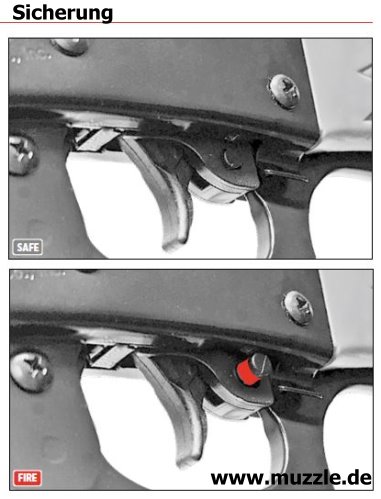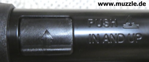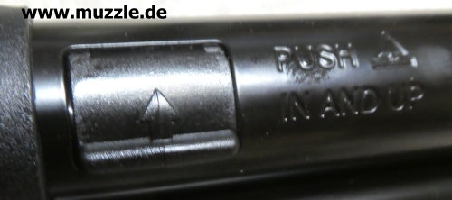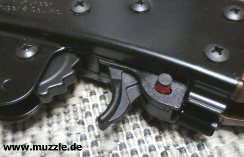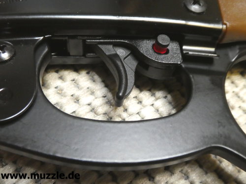 Sicherung Fotos unten: Das UX-“Marlin Rifle” ist mit einer manuellen Druckknopfsicherung ausgestattet. Linksseitig sieht man am herausstehenden Druckknopf hinter dem Abzugszüngel eine rote Warnmarkierung. Diese zeigt an, dass das Gewehr entsichert ist, also die Abzugmechanik nicht blockiert, sondern freigegeben ist.