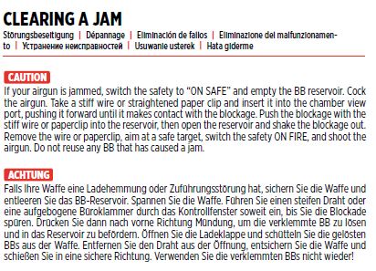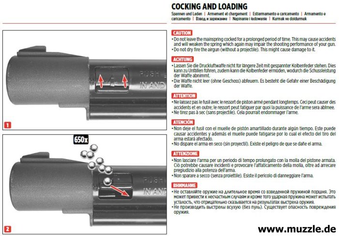 Die große Anzahl an BBs bringen bei Vollbeladung des Reservoirs ein erhöhtes Waffengewicht mit sich. Bei Bewegung lassen die Kugeln im Schüttmagazin ein deutlich hörbares Rasseln vernehmen. Wichtig! Die Waffe niemals mit gespannter Kolbenfeder lagern und niemals leer abschlagen (nicht ungeladen abfeuern)! Beides kann zu Defekten führen!