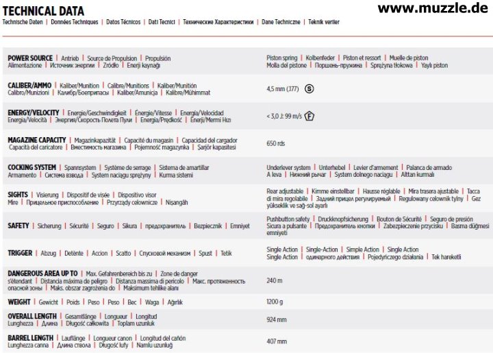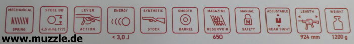 Visierung: Buckhorn-Kimme vertikal justierbar - Korn statisch Visierlinie: 442 mm Lauf: glatt (ohne Züge) Sicherung: manuelle Druckknopfsicherung Lauflänge: 406,40 mm Länge: 924 mm Gewicht: ca. 1.200 g Ausführung: Kunststoffschaft - Systemgehäuse und Laufmantel aus Stahlblech - Repetierhebel aus nichtmagnetischem Metall Bewertung: konstengünstige Langwaffe mit einfacher Ausstattung für das Hobby-Plinking auf bis zu 10 m Distanz Preis 2024/2025: um 35 - 40 Euro (Internet, Online-Fachhandel) Händler: Waffe erworben bei “Gottlob Brucklacher” https://www.brucklacher.eu/