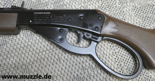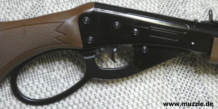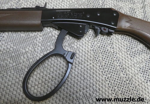 Spannhebel Beim “Marlin Lever Action Rifle” handelt es sich, wie der Name schon aussagt, um einen Unterhebelrepetierer im Westernstyle. Der Spannhebel ist als “Large-Loop-Lever” ausgeführt. Energetisch ist es eine Federdruckwaffe, die vor jedem Schuss erneut vorgespannt werden muss. Die Kolbenfeder wird durch das Nachvorneführen des Spannhebels gespannt. Anschließend wird Hebel wieder zurückgeführt und in die Aufnahmeklemme (Rasthalter) eingerastet.