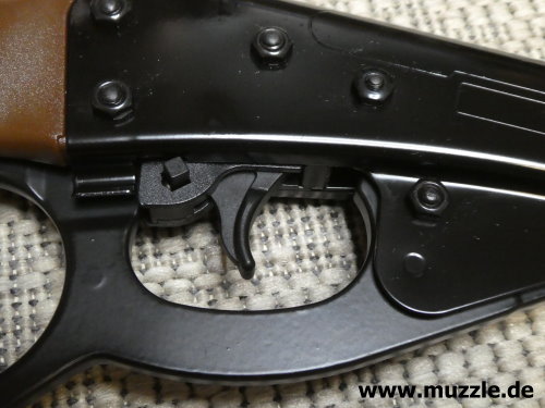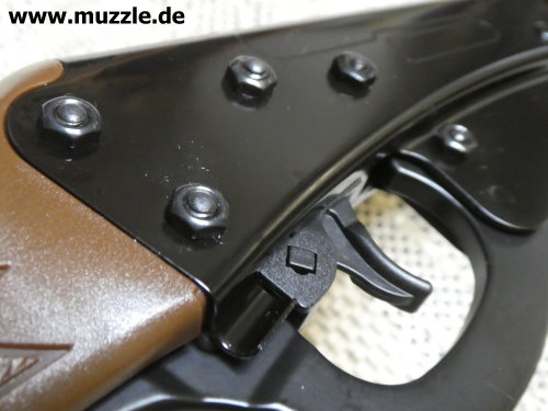 Fotos unten: Blick auf die Abzugseinheit mit Sicherungsknopf und den Rasthalter bei nach vorne geführtem Spannhebel.