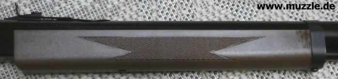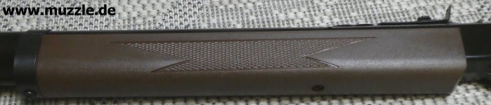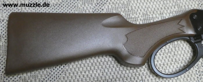 Schäftung Fotos unten: Der partiell gecheckerte Anschlag- und Vorderschaft besteht aus braunem Polymer. Optisch ist das Kunststoffmaterial kein Highlight, haptisch aber völlig ok. Kein Wackeln, kein Knarzen. Der Hinterschaft ist mit einem Pistolengriff ausgeführt.