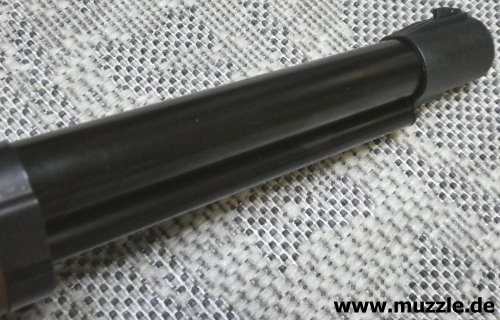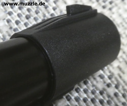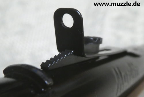 Visierung Fotos unten: Die Visierung dieser Druckluftwaffe besteht aus einer höhenverstellbaren Buckhorn-Kimme und einem festen, also statischen Korn. Letzteres sitzt auf einem an der Mündung montierten Kornträger aus Plastik. Auch hier leider wieder ein Bauteil, welche unter ästhetischen Gesichtpunkten keinen Gefallen finden kann.