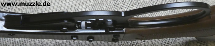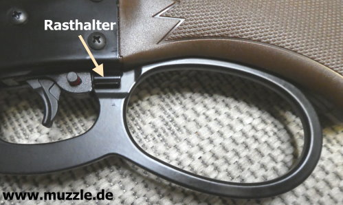 Fotos unten: Am Waffenkorpus befindet sich eine starke Klemme (Rasthalter) die den Spannhebel aufgrund einer beidseitig ausgeführten Auswölbung sicher arretiert.