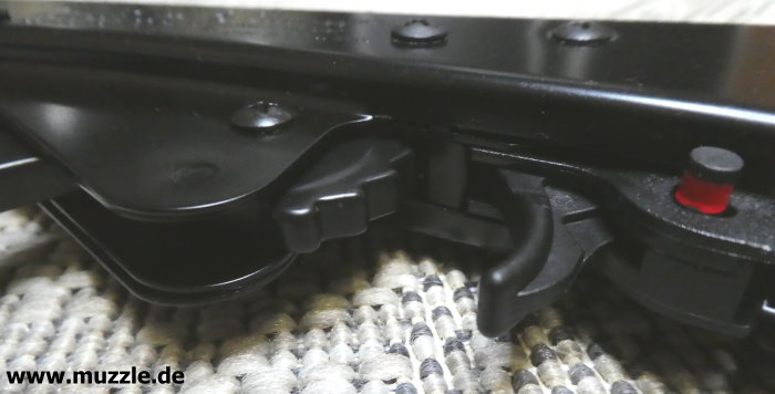 Bild unten: Rechtsseitig zeigt sich an gleicher Stelle ein herausragender, rechteckiger Knopf, wenn die Sicherung aktiviert (eingedrückt) ist.