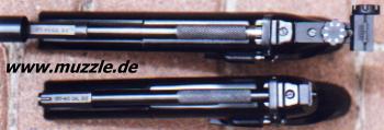 Kipplaufbuchse und nach hinten ausladenderes GehĂ€use verlĂ€ngert), Kimme seiten- und höhenverstellbar mittels groĂer StellrĂ€der mit Zahlenscala, die Kimmeneinheit kann gegen eine Zielfernrohrschiene ausgetauscht werden