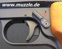 Sicherung: Schwenkhebel beidseitig am Griffstück, blockiert die Abzugsmechanik (Bilder unten links und mitte)