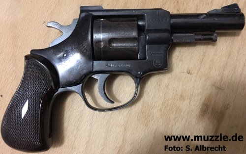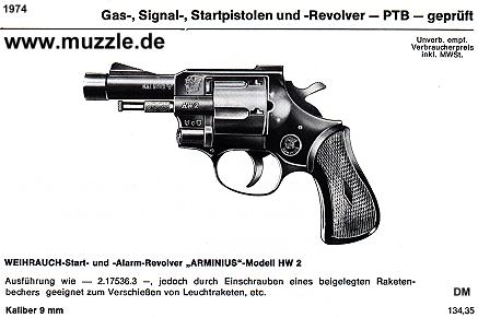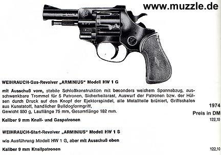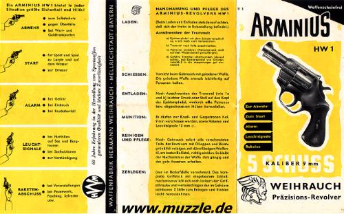 Hersteller: Weihrauch Modellbezeichnung: “Arminius HW1G” PTB 89-69 Serien-Nr.: 496493 (schwarz/brüniert) und 448537 (verchromt) Beschuss 1975 (brüniert) und 1973 (verchromt) Kaliber 9 mm K Trommelkapazität: 5 Schuss Abzugswiderstand: SA ca. 2.750 g, DA ca. 8.500 g