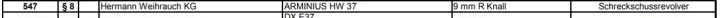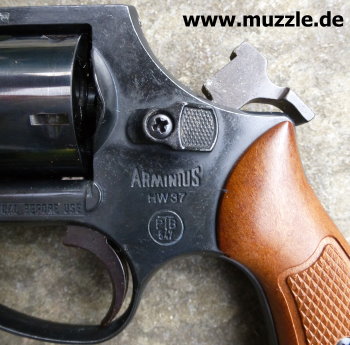 Hersteller/Anbieter: Hermann Weihrauch KG (später: Weihrauch & Weihrauch Sport GmbH & Co.) Modell: Arminius HW37 Seriennummer: 1449151 PTB: 547 Beschusszeichen: “N” für Nitrobeschuss; Wappen für Mellrichstadt; “KK” für Jahr 1999 Vorbild: Smith & Wesson Mod. 36 Chiefs Special