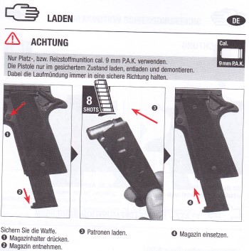 Serien-Nr.: L 130917448 System: Selbstlader, Reizstoff-/Signalpistole Kaliber: 9 mm P.A.K. (Munition mit NC-Pulver empfohlen) Magazinkapazität: 8 Patronen