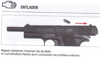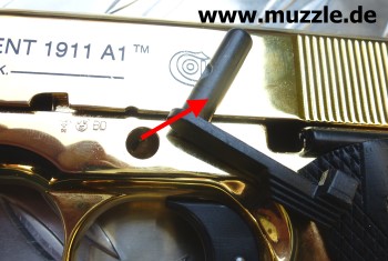 Die “Colt Government”-Pistole von UMAREX in der vorliegenden Version verfügt über zwei unterschiedliche Schlittenfangmethoden: Die beim Schießen automatisch erfolgende Verschlusssperre bewerkstelligt das leere Magazin. Nach Abgabe des letzten Schusses sperrt dieses den Schlittenvorlauf. Der eigentliche Schlittenfanghebel bleibt dabei ohne Funktion. Dieser kommt nur manuell zum Einsatz. Das heißt: Der Schlitten muss von Hand weiter nach hinten gezogen und der Fanghebel in die Raste am Schlitten gedrückt werden (Foto unten), was natürlich in dieser Form kein originalgetreuer Vorgang ist. Nun kann das Magazin per Knopfdruck (Magazinhalter am Griffstück hinter dem Abzug) herausgenommen werden.