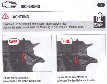Sicherung Mit dem linksseitig am Griffstück bedienbaren Schwenkhebel wird die Schlagbolzensicherung und Schlittensperre in Kraft gesetzt, bzw. die Pistole wieder entsichert. Fotos unten: In der oberen Position (“Safe”) wird die Abzugsmechanik blockiert. Abzugszüngel und schlitten können nicht nach hinten gezogen werden. Die Zündung einer im Patronenlager befindlichen Munitionskartusche wird somit zuverlässig verhindert. Der Hahn lässt sich aber noch spannen. - Foto unten rechts: Sicherungshebel in Position “Fire”. Die Waffe ist schussbereit.