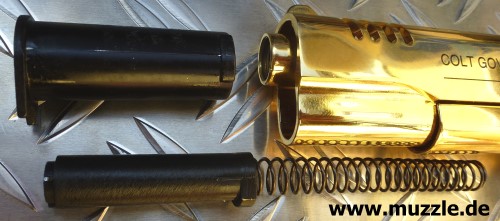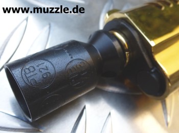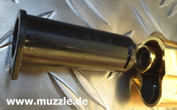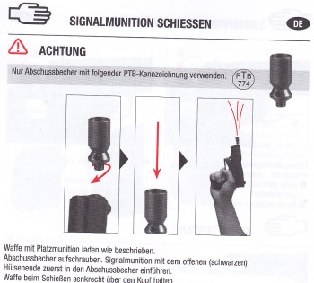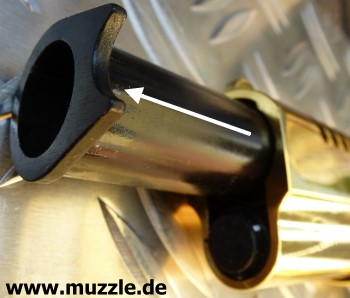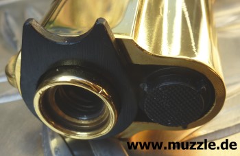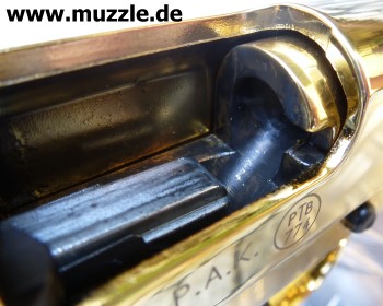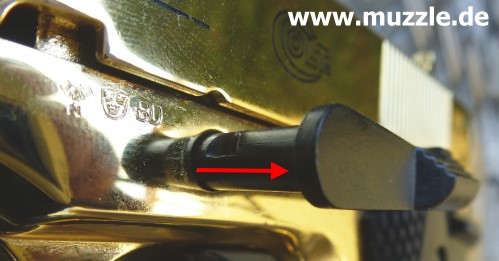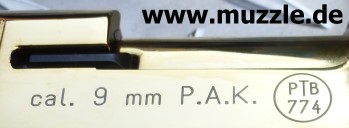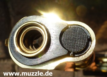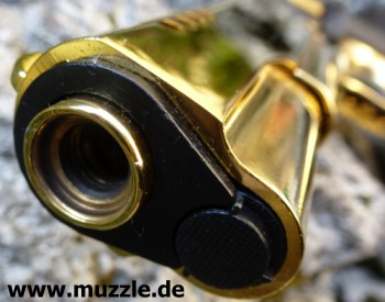 Mündungsansicht / Laufsperre / Signalbecher Neben vielen Sicherheitsauflagen der “ Physikalisch-Technischen-Bundesanstalt” (PTB) für Schreckschuswaffen ist eine der markantesten sicherlich die sogenannte Laufsperre. Dabei handelt es sich um meist mehrteilige Verbauungen des Innenlaufs, bestehend aus einer sehr harten Stahlsorte. Was zum Einen die unseligen „Bastler“ von ihrem illegalen Tun abhalten soll, dient zum Anderen auch elementar der Funktion der Waffe. Ohne den durch die Laufverbauung erhöhten Gasstaudruck, würde das Repetieren des Schlittens nicht einwandfrei funktionieren, da aus den Platz-/Gaspatronen kein Projektil verschossen wird, dass den Lauf zur Mündung hin abdichten würde.