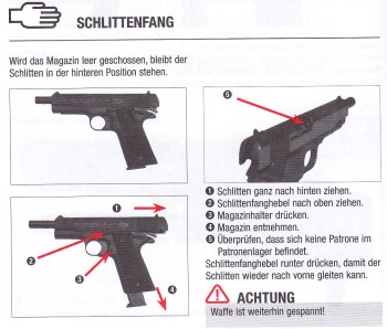 Hinweis: Im Gegensatz zur Katalog-Ankündigung (siehe oben) weist die ausgelieferte Version keinen vergrößerten Magazinhalter auf, sondern eine Standardausführung (Foto unten). ================================================================= “Ein Optimist kauft Gold und Silber, ein Pessimist Konserven.” (Anlegerweisheit) ;-) ================================================================= Griffschalen Die Pistole ist mit schwarz lackierten Holzgriffschalen ausgestattet, welche die edle Optik der Waffe abrunden und sich perfekt mit den schwarz gefärbten Bedienteilen ergänzen.