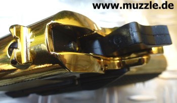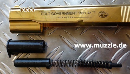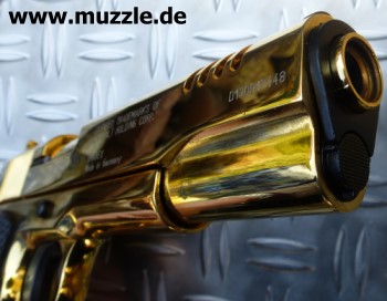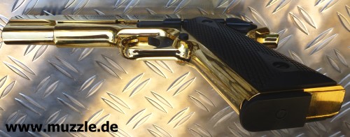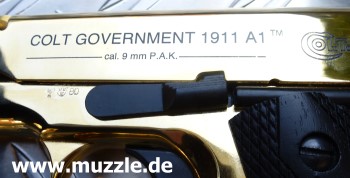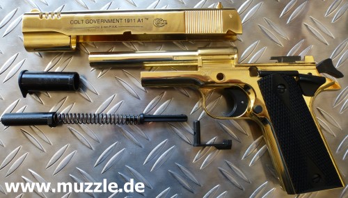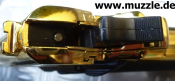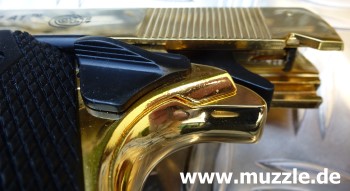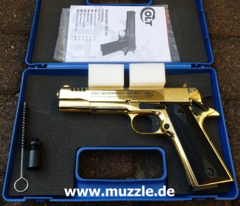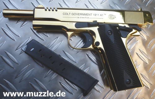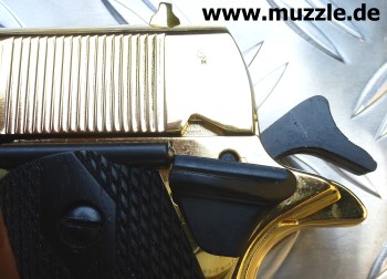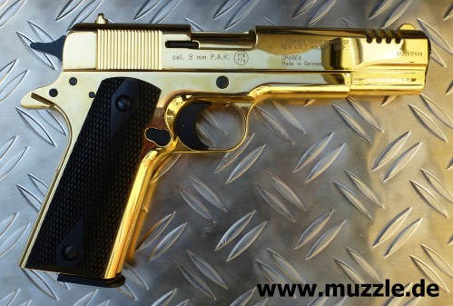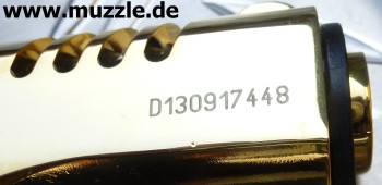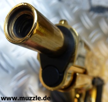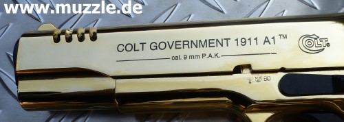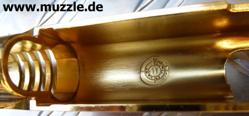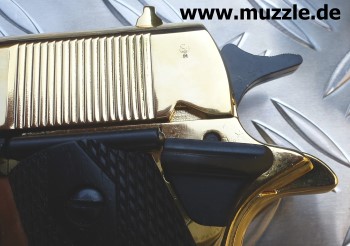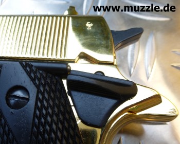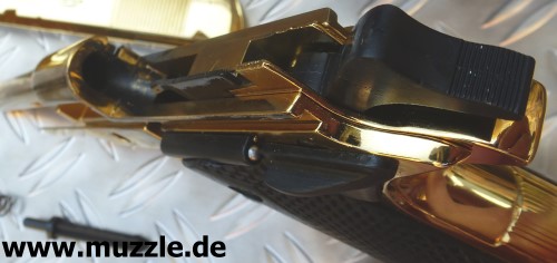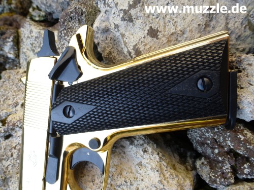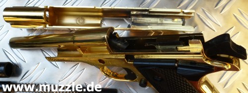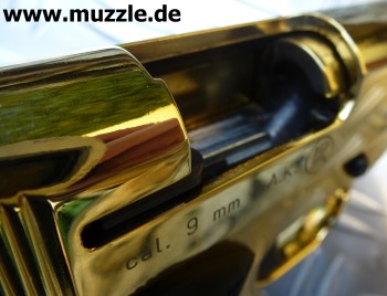 Ausführung: Spritzgusskorpus vergoldet - Holzgriffschalen schwarz lackiert - Stahlblechmagazin - Bedien- und Funktionsteile überwiegend Zinkguss, teilweise Stahl (z. B. Auszieherkralle, Schlagbolzen) - Schlittenfanghebel vorhanden, aber ohne automatische Funktion, sondern Schlittensprerrung durch entleertes Magazin. Lieferumfang: Waffe, Signalbecher, Reinigungsbürste, mehrsprachige Bedienungsanleitung im Kunststoffkoffer. Bewertung: Hochwertige Optik durch saubere Verarbeitungsqualität und edles Goldfinish. Wenige, marginale Unebenheiten in der Gussoberfläche vorhanden. Funktionstest: Lediglich mechanische Funktion geprüft, kein Schusstests mit Munition durchgeführt. Preis 2013: ca. 200,- EUR Rechtliches: Besitz der Waffe frei ab dem vollendeten 18. Lebensjahr. Öffentliches Führen nur erlaubt mit dem “Kleinen Waffenschein”, zwingend in Verbindung mit einem gültigen Personaldokument (Ausweispapiere).