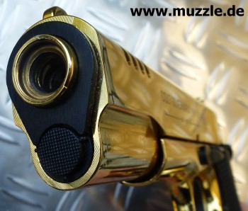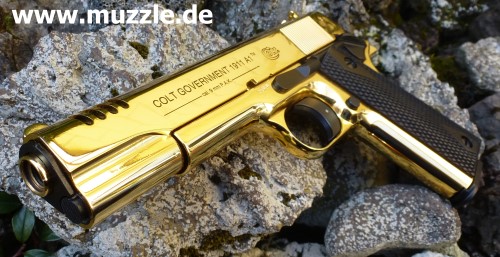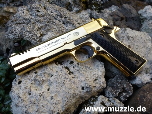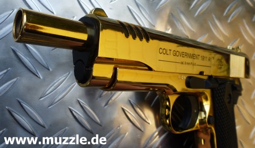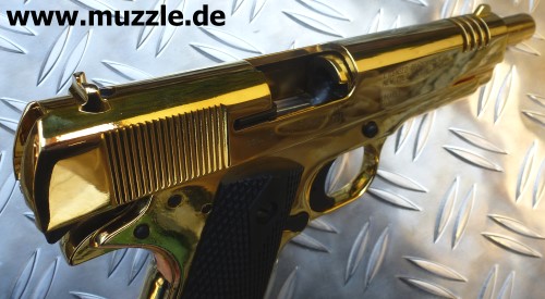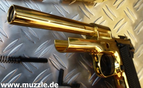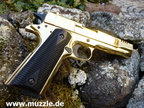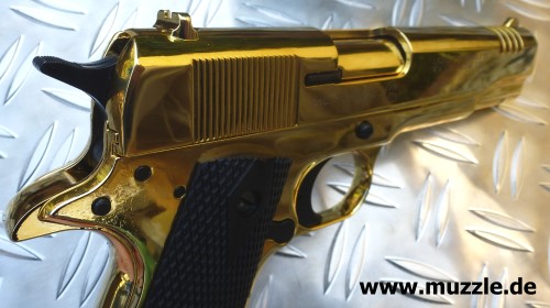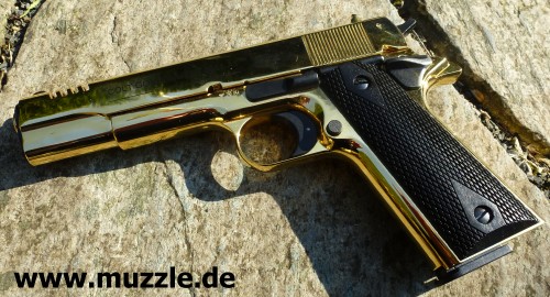 Meinung Das Modell “Colt Government 1911 A1” ist mit seinem zeitlosen Design ein absoluter Klassiker und darf im Hinblick auf seine über hundert Jahre alte Geschichte wohl mit Fug und Recht als “legendär” bezeichnet werden. Wegen ihrer großen Beliebtheit wird die Waffe dann gerne auch für Sondermodell-Auflagen hergenommen. Mit diesem “Goldstück” hat UMAREX den Liebhabern dieser Pistole mal wieder einen Appetithappen vorgesetzt, an dem man als Sammler nur ungern vorbeigehen mag. Sicher ist die Pistole in dieser Ausführung eher, oder besser ausschließlich, als Schmuck- und Vitrinenstück anzusehen, denn als schnöder SSW-Gebrauchsgegenstand (weshalb ich auf einen Schießtest verzichtet habe). Das Goldfinish mag manchem vielleicht zu protzig wirken und ist, wie alles im Leben, eine Geschmacksfrage über die sich ja immer vortrefflich - wenn auch sinnlos - streiten lässt. Eines ist jedoch unbestreitbar: Die “Gold Rush Edition” hinterläßt einen glänzenden Eindruck und Fettfinger beim Betasten lästige Abdrücke darauf. Ein geeignetes Putztuch also besser immer bereithalten. ;-)
