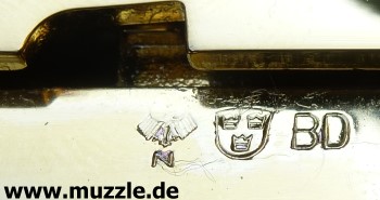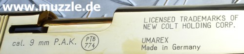 Hersteller: UMAREX Sportwaffen GmbH & Co. KG (Arnsberg) www.umarex.com Fertigung: Made in Germany Modell: Colt Government 1911A1 (Lizenzfertigung) Sonderedition: “GRE” (Gold Rush Edition) PTB-Nr.: 774 Beschusszeichen: Nitrobeschuss, Beschussamt Köln, “BD” (“B”=1 “D”=3 -> Jahr 2013)