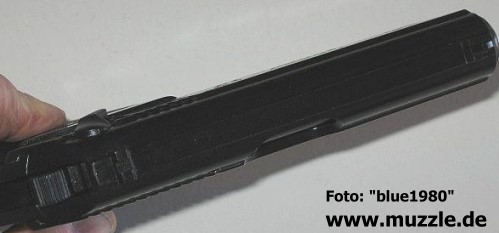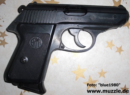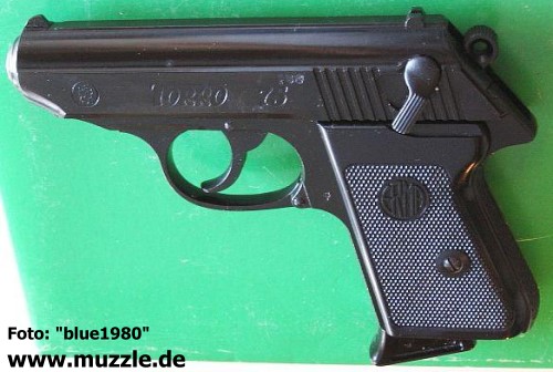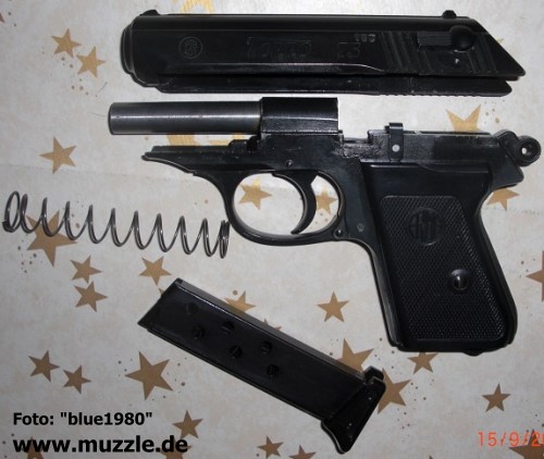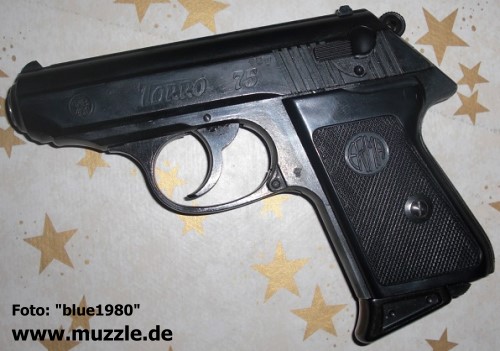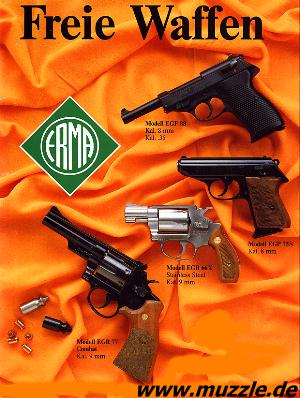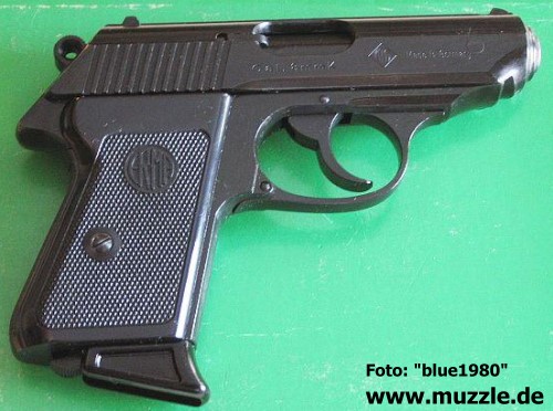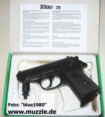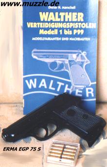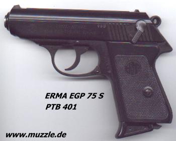 Hersteller: ERMA-Werke, Waffen- und Maschinenfabrik GmbH, 8060 Dachau Fertigung: Made in Germany Modell: “EGP 75 S” (“S” = Spannabzug), Pistole auch unter “Torro 75” vermarktet. Baugleich: “Crosman CX” Vorbild: “Walther PPK” PTB-Nr.: 401 (davor: 69/3, 69/4) Vorgängermodell: “EGP 75”, seit 1974, PTB 69, PTB 69/2, sowie mit irrtümlicher Stempelung (Zahlendreher) PTB 96/2 Beschusszeichen: Nitrobeschuss, Beschussamt Mellrichstadt, “KE” (“K”=9 “E”=4 -> Jahr 1994) Serien-Nr.: 112941 System: Selbstlader, Reizstoff-/Signalpistole Kaliber: 8x20 mm K Magazinkapazität: 8 Patronen Abzug: Spannabzug, Double Action (DA) / Single Action (SA) Maße: 155 x 115 Gewicht: 590 g Sicherung: Schlagbolzensicherung manuell (linksseitig) Ausführung: Zinkgussgriffstück und Schlitten brüniert - Kunststoffgriffschalen schwarz - Stahlblechmagazin - Bedien- und Funktionsteile überwiegend Stahl (z. B. Lauf, Schlagbolzen, Stoßboden, Sicherungshebel, Aus- zieherkralle). Lieferumfang: Waffe, Signalbecher, Reinigungsbürste, Bedienungsanleitung im Kunststoffkoffer. Fertigung “EGP 75 S”: 1978 - 1994 Bewertung: Technisch und optisch sehr saubere Verarbeitungsqualität. Bemerkungen: Der Firmenname “ERMA” leitet sich ab von “Erfurter Maschinenfabrik”, die Modellbezeichnung “EGP” steht für “ERMA” Gaspistole. Rechtliches: Besitz der Waffe frei ab dem vollendeten 18. Lebensjahr. Öffentliches Führen nur erlaubt mit dem “Kleinen Waffenschein”, zwingend in Verbindung mit einem gültigen Personaldokument (Ausweispapiere). Zur Bedienungsanleitung ---> klick