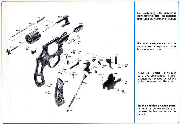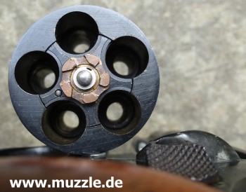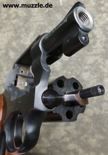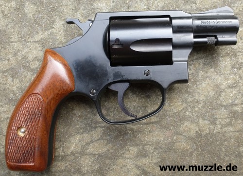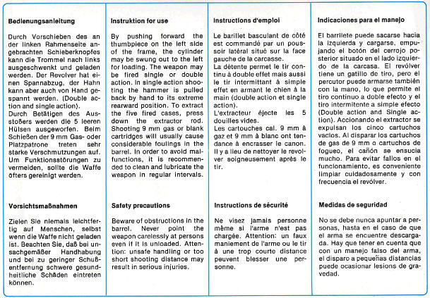 Serien-Nr.: 070712 System: Revolver, Reizstoff-/Signalpistole Kaliber: 9 mm Knall (.380) Trommelkapazität: 5 Patronen Trommelspalt: 0,2 mm Abzug: Spannabzug, Double Action (DA) / Single Action (SA) Abzugswiderstand: SA = ca. 2.200 g, DA = ca. 8.000 g Lauflänge: 47 mm (1.875”) Visierung: Visierlinie 90 mm Länge: 160 mm Höhe: 107 mm Breite: 33 mm Gewicht: 548 g (leer)