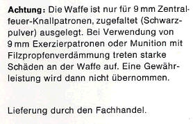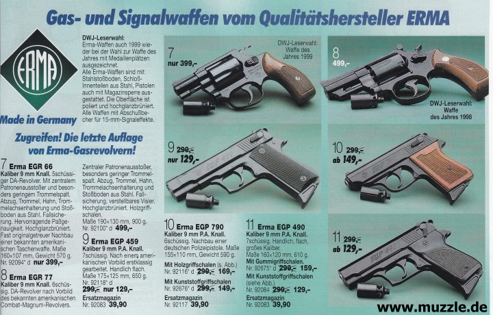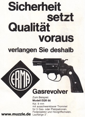 Ausführung: Zinkgussgriffstück - Holzgriffschalen - Bedien- und Funktionsteile Stahl (z. B. Trommel, Trommel- achsenhalterung, Abzug, Lauf, Schlagbolzen, Stoßboden). Revolver hochglanzbrüniert Weiteres Modell: “EGR66 X” (PTB162/2), gleiche Waffe, aber komplett aus Edelstahl gefertigt Lieferumfang: Waffe, Signalbecher, Reinigungsbürste, Bedienungsanleitung im Kunststoffkoffer. Fertigungszeitraum: 1976 - 1994 Bewertung: Technisch und optisch sehr saubere Verarbeitungsqualität. Funktionstest: Lediglich mechanische Funktion geprüft, keine Schusstests mit Munition durchgeführt. Bemerkungen: Der Firmenname “ERMA” leitet sich ab von “Erfurter Maschinenfabrik”, die Modellbezeichnung “EGR” steht für “ERMA” Gasrevolver. Das Unternehmen baute Gas-/Signalwaffen von 1974 bis zu seinem Erlöschen 1997. Preis 1997: 399,- DM Listenpreis “Frankonia” Rechtliches: Besitz der Waffe frei ab dem vollendeten 18. Lebensjahr. Öffentliches Führen nur erlaubt mit dem “Kleinen Waffenschein”, zwingend in Verbindung mit einem gültigen Personaldokument (Ausweispapiere).