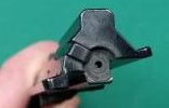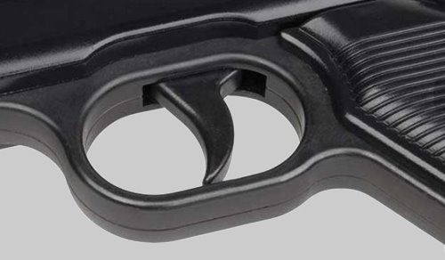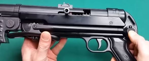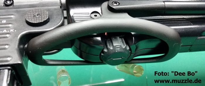 Bild unten: Abzug. Bei der “GSG MP40” im Kaliber 9 mm P.A.K. handelt es sich um einen semiautomatischen Selbstlader mit Single-Action Abzug. Dauerfeuer bei hinten gehaltenem Züngel ist bei dieser Replika einer historischen Maschinenpisole also nicht möglich, da in Deutschland verboten.