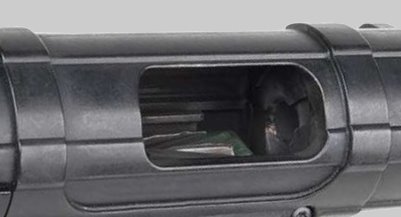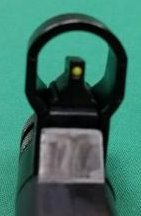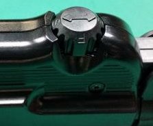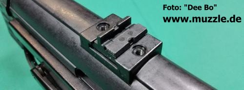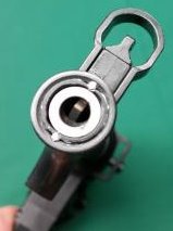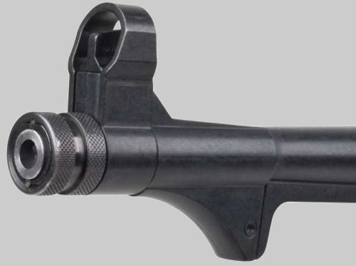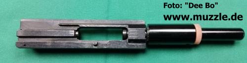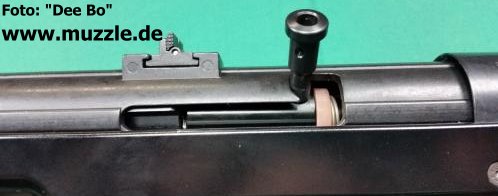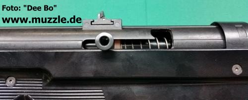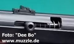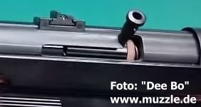 löst dann nur noch den Schlagbolzen bzw. Hammer aus. Vorteil: Keine große Massebewegung vor der Schussauslösung, die sich auf die Waffe übertragen kann. Durch die ruhigere Auslösung erhält man eine bessere Grundpräzision. ================================================================= Bild unten: Mündungsansicht mit starrem Balkenkorn auf hohem Kornträger und schützendem Korntunnel. Die Mündungsschraube (muzzle cap) ist bei der Schreckschusswaffe nicht abschraubbar. Ein Mündungsgewinde für einen Becher zum Abschuss von Pyromunition ist nicht vorhanden.
