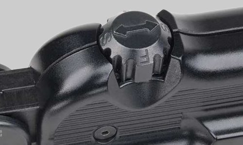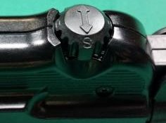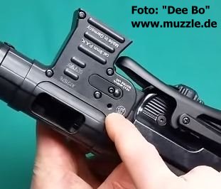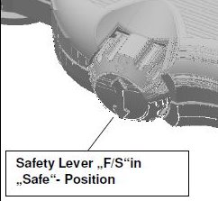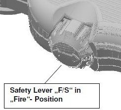 Bilder unten: Die manuelle Sicherung befindet sich unten am Griffstück. Es handelt sich um einen Drehknopf mit Rändelrand. Auf dem Foto unten befindet er sich Position “fire”. Der aufgeprägte Doppelpfeil zeigt in Mündungsrichtung, an den Seiten zeigt das “F” für “fire” dem Schützen die Feuerbereitschaft an.