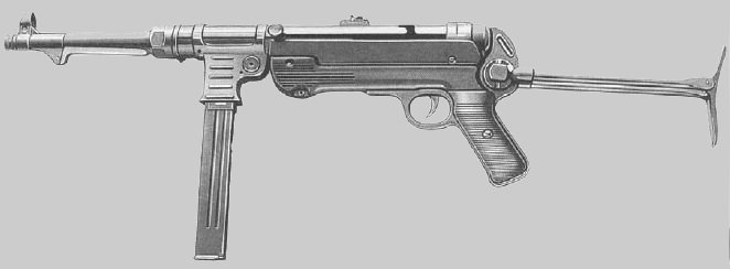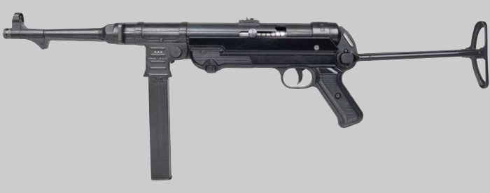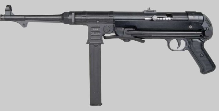 Kaliber: 9 mm Parabellum Magazinkapazität: 32 Patronen im Stangenmagazin / 64 Patronen im raren Doppelmagazin Länge: 832 / 629 mm Gewicht: 3,97 kg Lauflänge: 251 mm Die MP 40, eine Weiterentwicklung der MP38 aus dem Jahr 1938, wurde seit Anfang 1940 hergestellt und war die Standardmaschinenpistole der deutschen Wehrmacht im Zweiten Weltkrieg. Wegen der Beteiligung Hugo Schmeissers an der Produktionsfirma und dem Aufdruck seines Namens auf den Magazinen wurde die MP40 vor allem beim englischsprachigen Gegner als die “Schmeisser” bekannt. Entwickelt wurden die MP38 und MP40 von Heinrich Vollmer in der Erfurter Maschinenfabrik Geipel (ERMA). Beide Typen basierten konstruktiv auf der von Schmeisser entwickelten und gebauten MP36. Hergestellt wurden sie bei ERMA, C. G. Haenel in Suhl und in den Steyr-Werken in Österreich, welche die Produktion als letzte im Oktober 1944 einstellten und auch die größte Stückzahl der MP40 herstellten. Die Gesamtproduktion aller Hersteller beträgt 1.047.100 Stück. Quelle: https://de.wikipedia.org/wiki/Maschinenpistole_40 Funktionsweise der MP40: Sichern, laden und schießen: Die MP wird mit der rechten Hand im Schwerpunkt erfasst und der Kammergriff mit der linken Hand gegen den Druck der Schließfeder zurückgezogen und nach oben in die Sicherungsrast gelegt. Dann wird mit der linken Hand das Magazin in den Magazinschacht eingesetzt, bis er hörbar einrastet. Die MP ist geladen und gesichert. Entsichert wird, indem mit der linken Hand der Kammergriff in die hinterste Position zurückgezogen und dann nach vorne geführt wird, wobei man die Kammer, dem Druck der Schließfeder langsam nachgebend, vorgleiten lässt, bis sie vom Abzugstollen gehalten wird. Der Abzugstollen hält den zurückgezogenen Verschluss fest, die Maschinenpistole ist entsichert. Beim Zurückziehen des Abzugzüngels wird der Abzugsstollen nach unten geschwenkt und der Verschluss freigegeben. Durch den Druck der Schließfeder schnellt der Verschluss nach vorne, wobei die oberste Patrone aus dem Magazin in den Lauf bzw. das Patronenlager geschoben wird. Der Schlagbolzen löst den Schuss aus. (Zuschießendes System) Magazinwechsel: Beim Magazinwechsel wird der Kammergriff mit der linken Hand bis in die Sicherungsrast zurückgezogen. Dann wird mit der linken Hand das Magazin umfasst, die Magazinsperre gelöst, das Magazin entnommen und ein neues eingesetzt. =================================================================