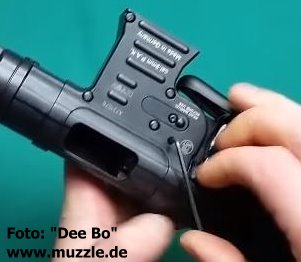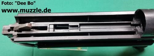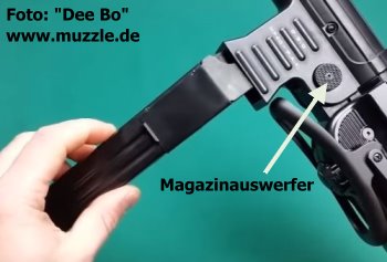 Bild unten: Durch drücken des Magazinauswerfers wird das Stangenmagazin freigegeben und kann aus dem Schacht entnommen werden.