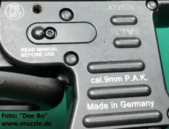 Serien-Nr.: A731576 System: Semiautomatischer Selbstlader, Schreckschusswaffe Kaliber: 9 mm P.A.K. - (Pistole Automatik Knall) Magazinkapazität: 24 Kartuschen (24 +1) Abzug: Single Action (SA) Lauf: Stahlrohr mit Laufsperre Sicherungen: 2 manuell Vorrichtungen. 1.) Drehknopf hinter der Magazinaufnahme blockiert in Position “S” die Abzugsmechanik. 2.) Kammergriff in die Sicherungsrast bringen. Visierung: Starr, Balkenkorn mit Korntunnel, Doppelkimme (eine davon klappbar)