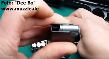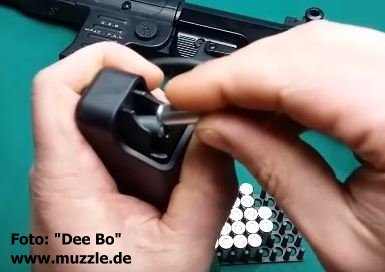 Fotos unten: Das Aufmunitionieren des 24 Kartuschen (Kaliber 9 mm P.A.K.) fassenden Stangenmagazins. Oben ohne Hilfsmittel, unten unter Zurhilfenahme der praktischen Ladehilfe, welche der Waffe beiliegt. So kann man den Gegendruck der strammen Magazinfeder deutlich leichter beherrschen.